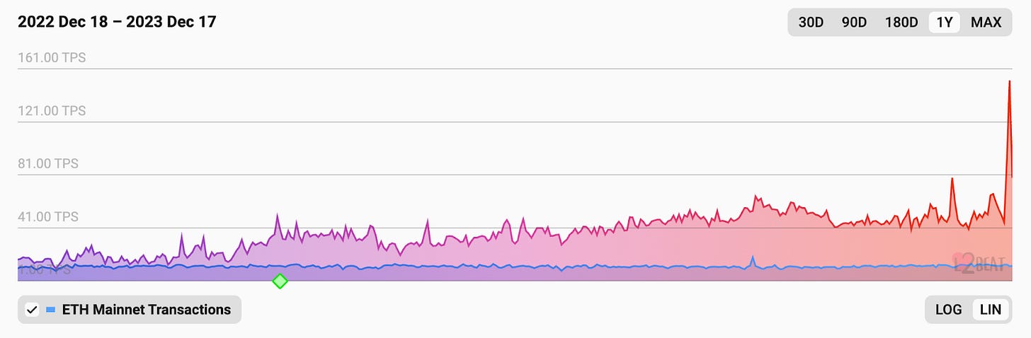 L2s are referred to as rollups because they enable batching of transactions to scale mass transaction throughput. This can be seen in the L2 Beat graph below which measures transactions per second (TPS) on L1 and L2 chains over a 12 month period from December 2022 to December 2023. The blue line represents the Ethereum L1, averaging about 12 TPS. The red line represents the L2 rollup ecosystem over the same period, averaging 50 TPS, with a meteoric rise to 150 TPS in December this year.